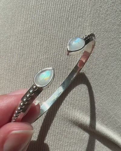 Dieser elegante Armreif wird von zwei schimmernden Mondsteinen geziert, die sich offen gegenüberstehen und sanft das Licht einfangen. Der Mondstein steht symbolisch für Neubeginn, Intuition und innere Balance – ein Begleiter für Veränderung und persönliches Wachstum. Trage ihn als tägliche Erinnerung daran, offen für neue Wege zu sein und jeder Phase deines Lebens mit Vertrauen zu begegnen.