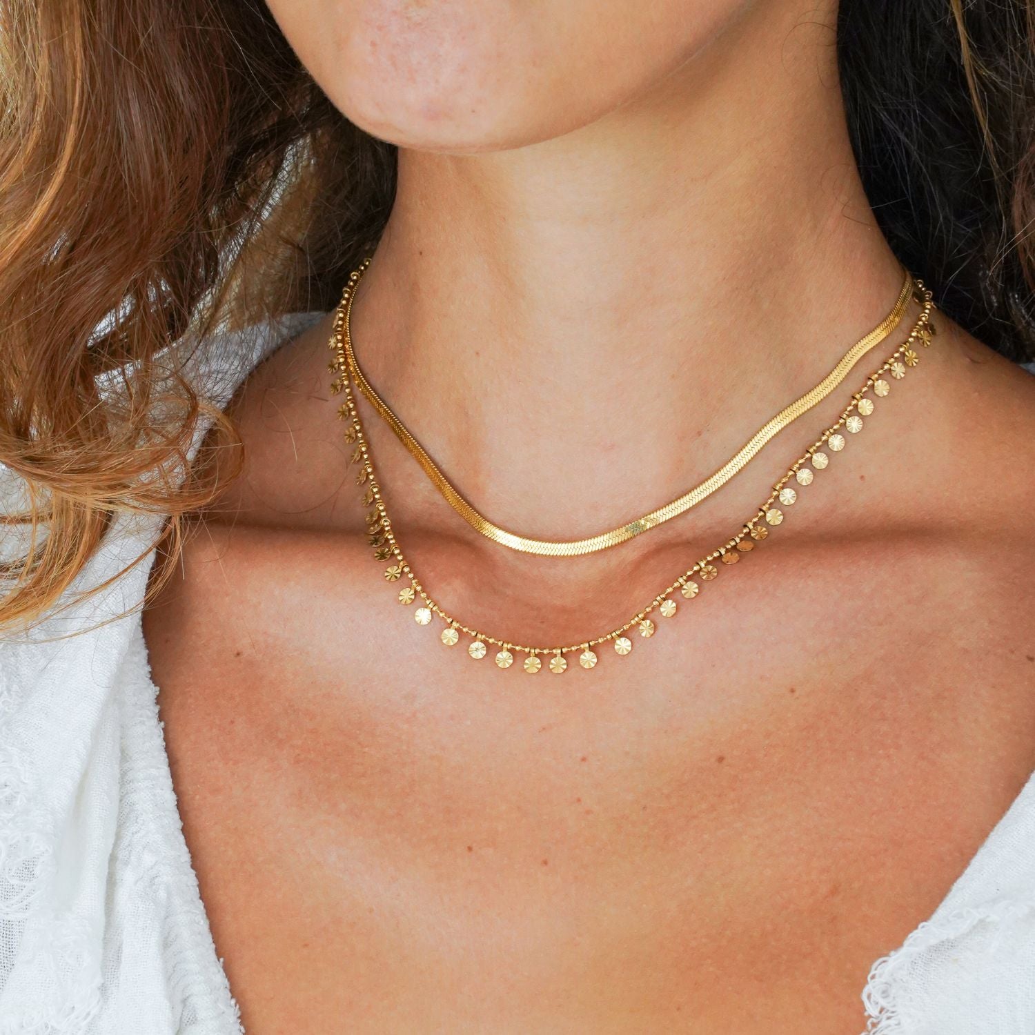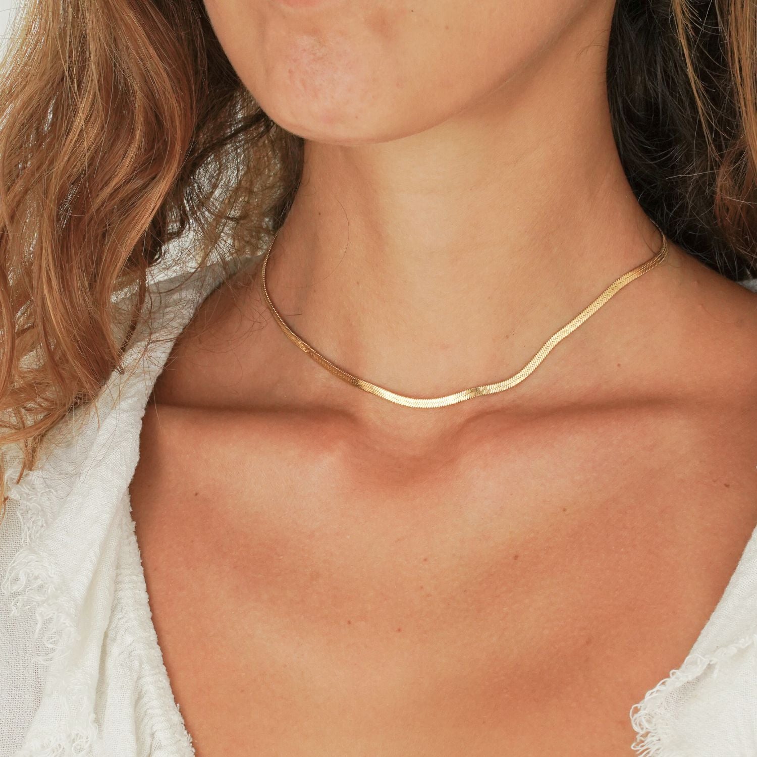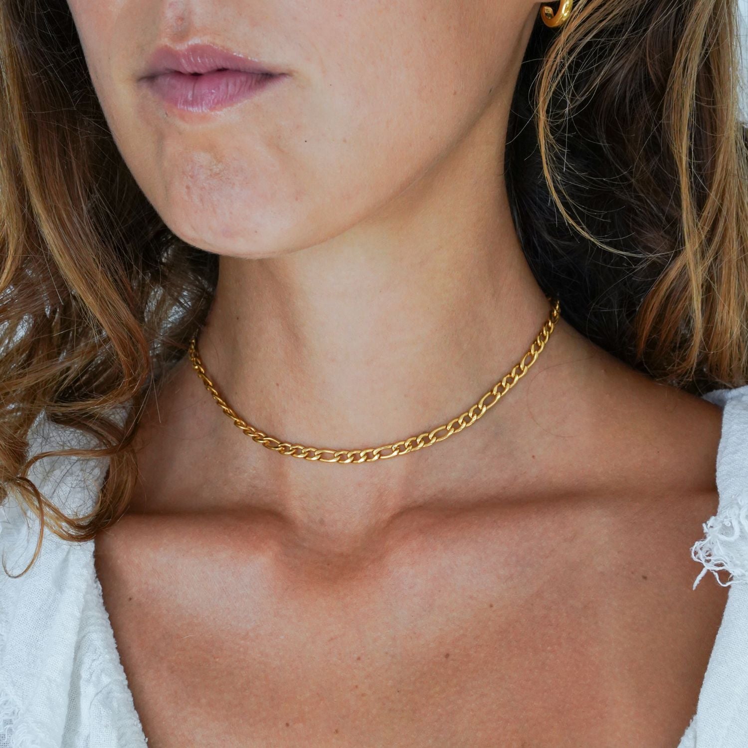 Beginne mit einer kurzen Basic-Kette, idealerweise einem Choker oder einer feinen Curb Chain mit einer Länge von 35–40 cm. Diese Kette sitzt nah am Hals und bildet die Grundlage für dein Layering.