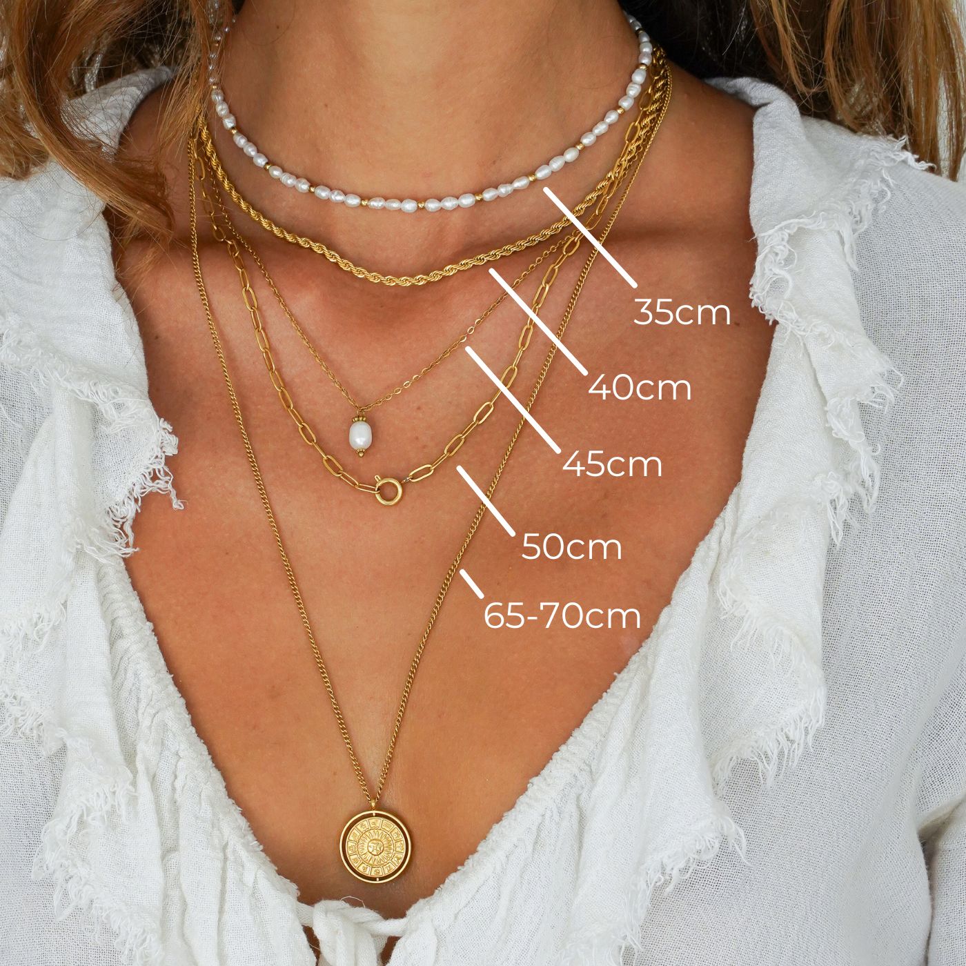 Es wichtig, dass die Ketten jeweils einen Längenunterschied von etwa 5cm haben – so entsteht der gewünschte Layering-Effekt und Verheddern wird vermieden. Hier ein kurzer Überblick über die verschiedenen Längen: