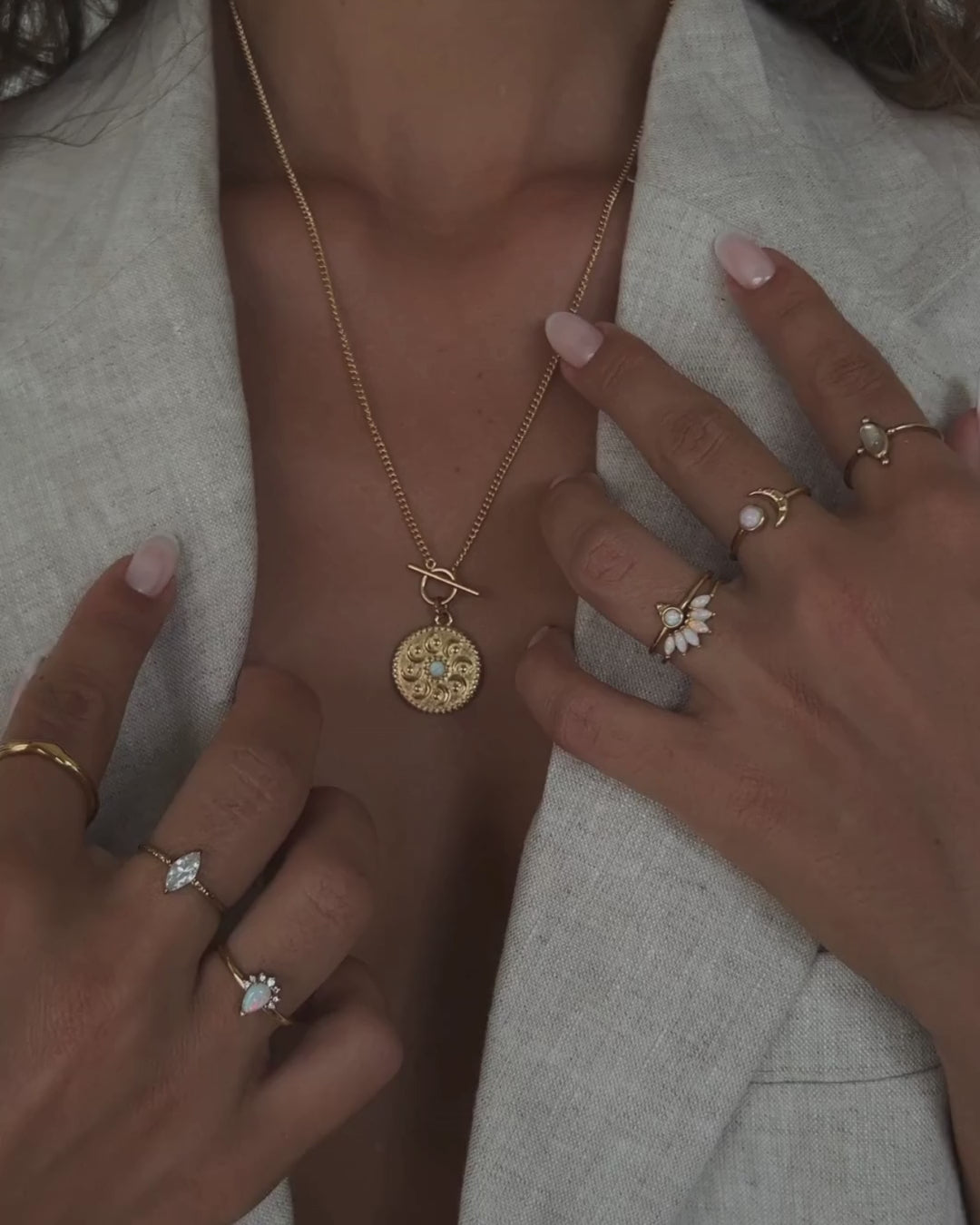 Die Halskette Serenity ist ein zweiseitiges Design voller Bedeutung: Vorne trägt sie einen wunderschönen Opal, der für Kreativität und Inspiration steht.